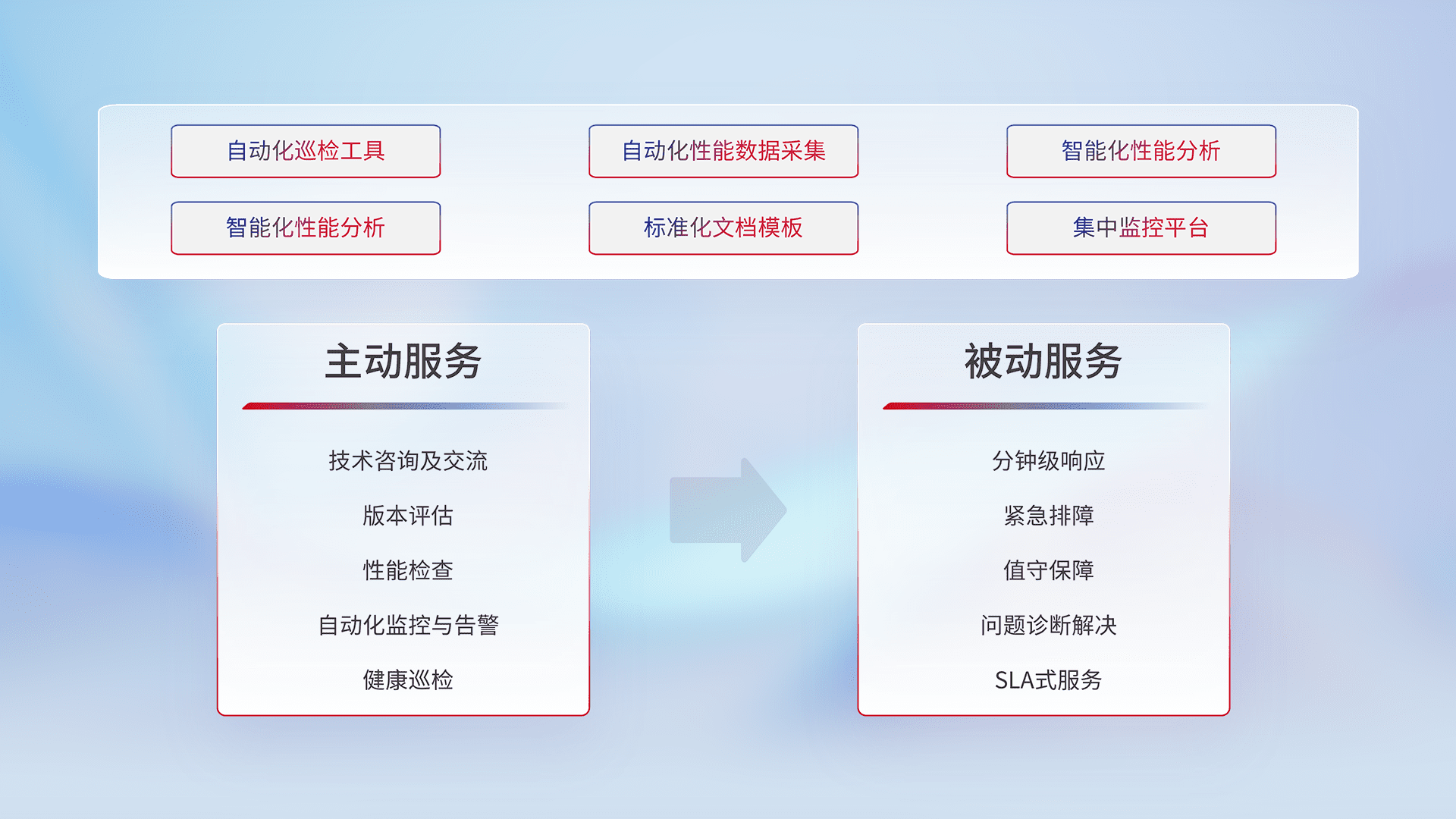 智能化工具和标准化文档,,,,保障服务质量,,提供主动服务(包含技术咨询、、、、版本评估、、、性能检查、、、、自动化监控与告警、、健康巡检)和被动服务包含(分钟级响应、、、、紧急排障、、、、值守保障、、、、问题诊断解决、、、、SLA服务)。。。