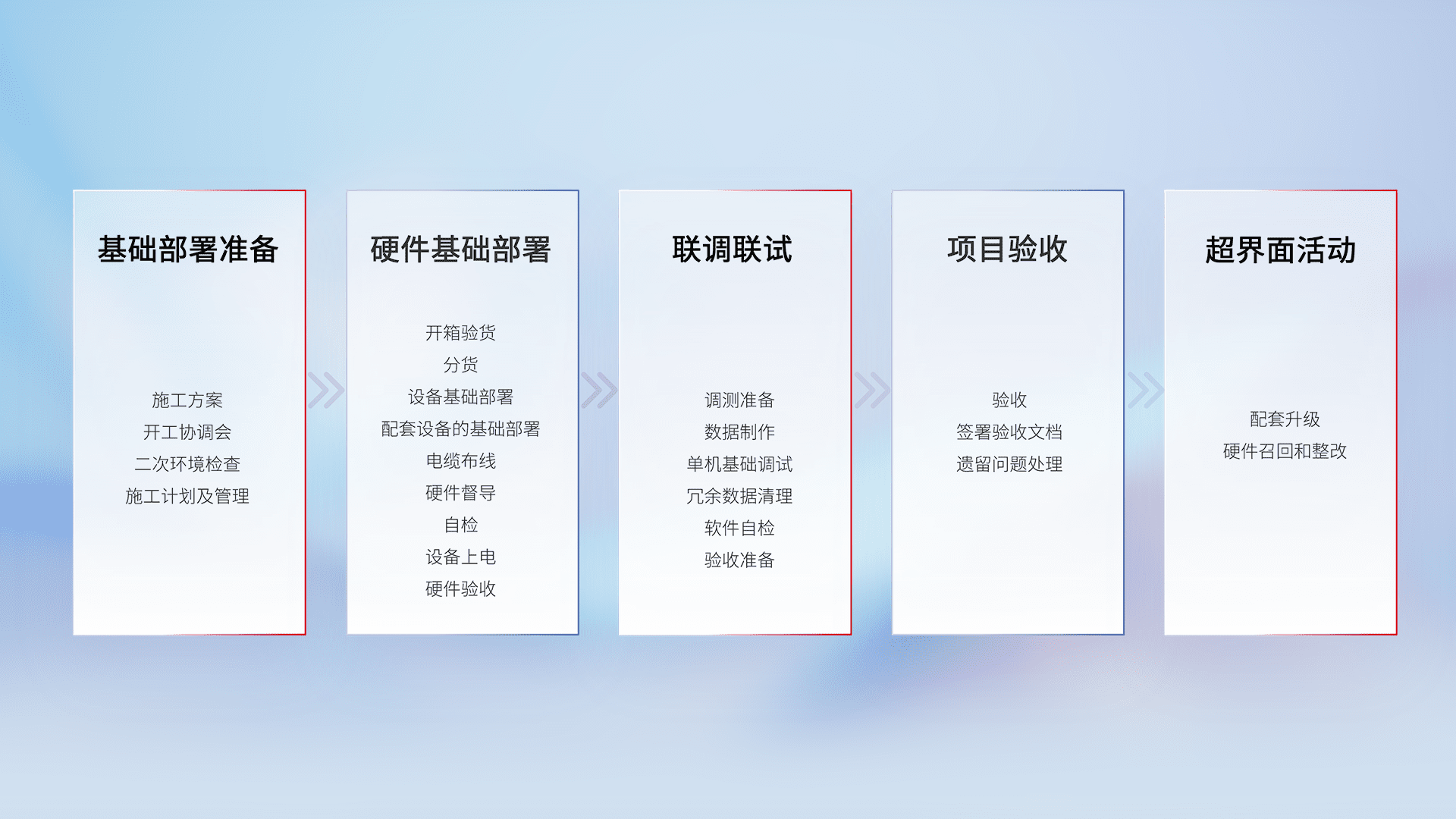 从基础部署准备、、硬件基础部署、、、联调联试、、、、项目验收、、、、越界面活动的全过程可追溯,,保证施工质量和进度。。。。